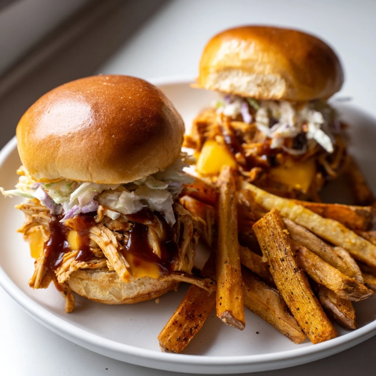 I first made these BBQ chicken sliders for a backyard get-together and they quickly became a crowd favorite. The tender chicken, melty cheese, and crunchy coleslaw make every bite incredibly satisfying—and the fries always disappear fast!