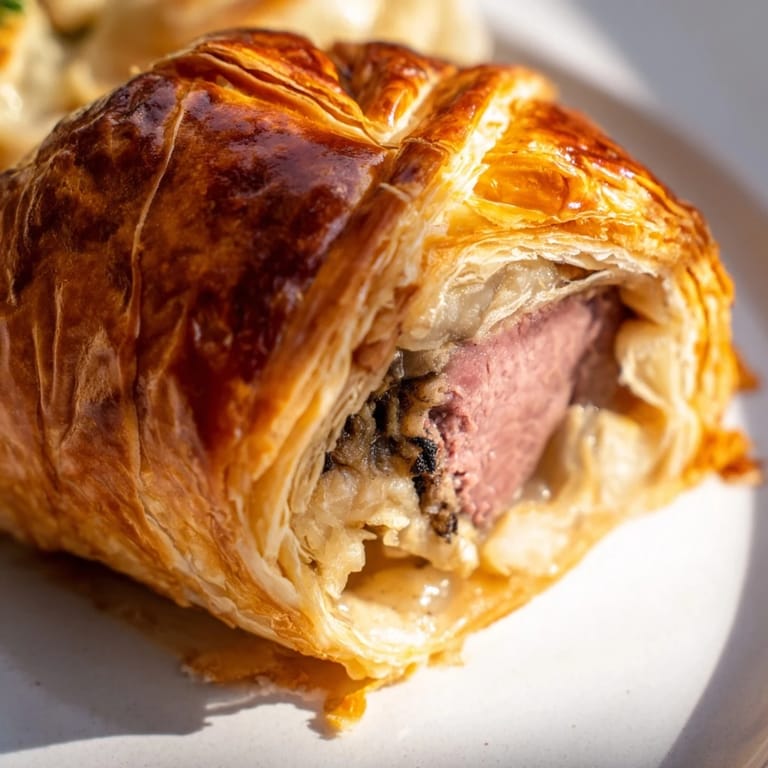 Substitute beef with mushrooms or roasted vegetables for a vegetarian version. Serve with cranberry chutney or horseradish cream for a festive touch. Ensure duxelles is well-cooked and dry to avoid soggy pastry.