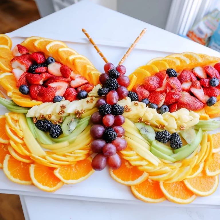 Save to Pins A vibrant and whimsical fruit tray arranged in the shape of a beautiful monarch butterfly, perfect for parties, kids events, or a healthy summer treat.