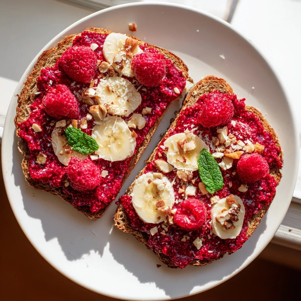 The toast itself is just the vehicle—the real magic happens in the layers you build on top. Fresh raspberries and mint leaves keep things bright and summery, while banana slices add body and natural sweetness. Coconut flakes bring texture and a subtle tropical note, and chopped nuts add the crunch that makes every bite interesting. I've learned to treat toppings like a conversation: each one adds something new to what the jam is already saying.