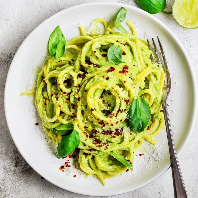Serve this vibrant pasta immediately while still warm, allowing the creamy avocado sauce to shine. A final sprinkle of fresh basil or cilantro adds a pop of color and freshness, while extra chili flakes provide a visual and flavorful kick. Don't forget those lime wedges on the side — a final squeeze just before eating brightens all the flavors.