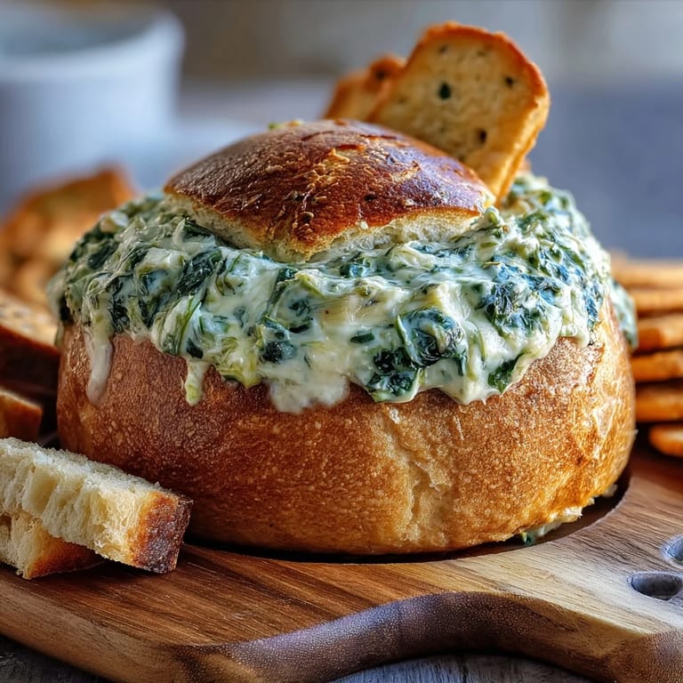 Make sure your cream cheese is fully softened at room temperature before mixing—this ensures a smooth, lump-free dip. When hollowing out the bread bowl, work carefully to maintain a sturdy 1-inch wall thickness; too thin and it may break, too thick and you won't have enough room for the dip. Don't skip sautéing the spinach, as this step removes excess moisture that could make your dip watery. For the smoothest texture, mix the cheese base thoroughly before adding the spinach and artichokes. If you're preparing this ahead, you can hollow out the bread and mix the dip up to 4 hours in advance, then fill and bake just before serving.