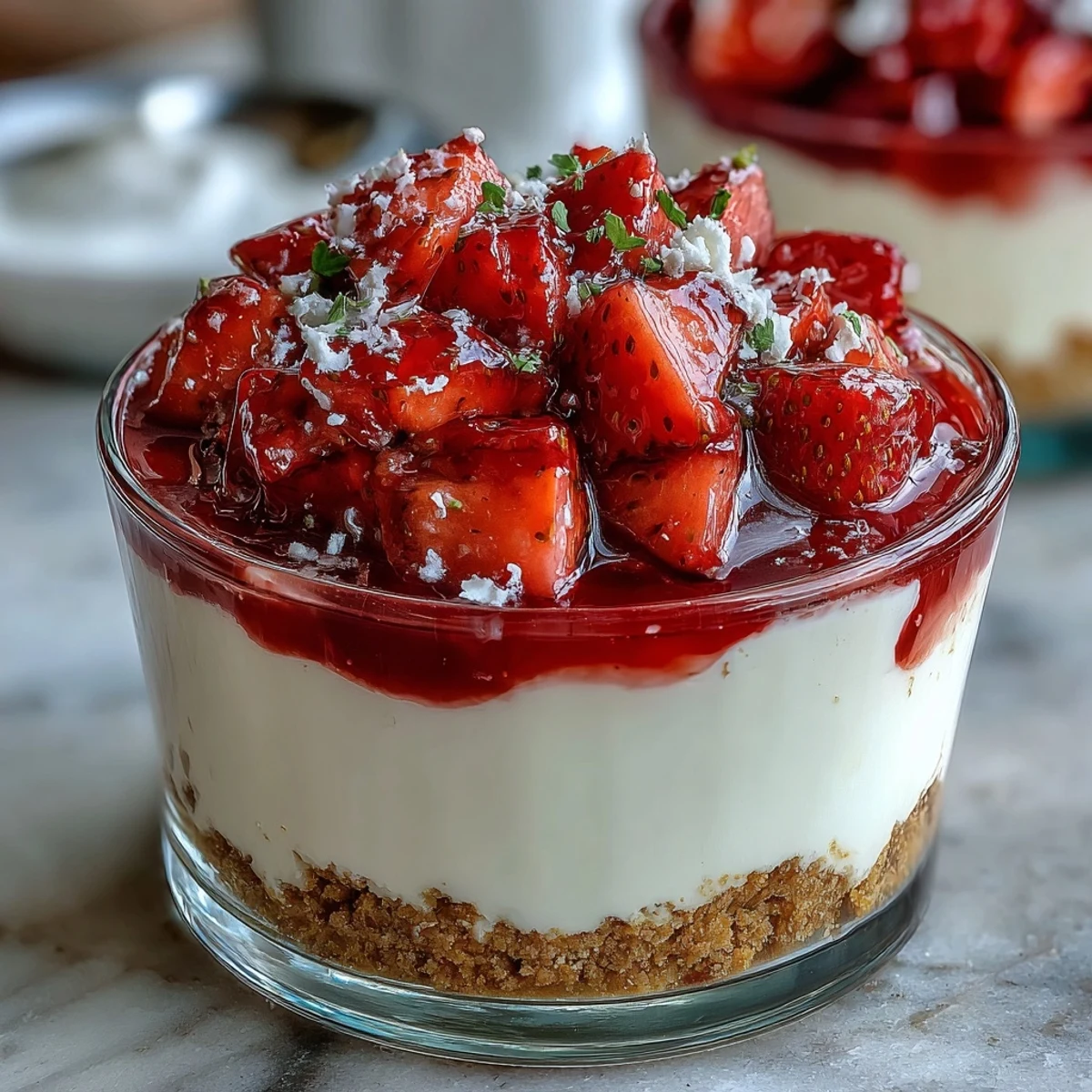 - Spoon the strawberry mixture over the cheesecake layer in each cup.