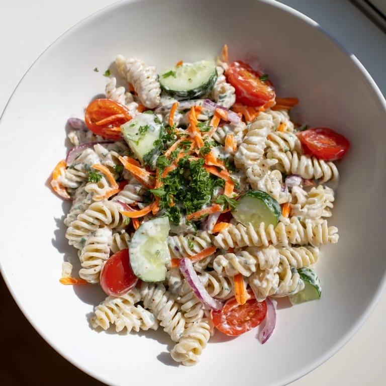 Save to Pins A creamy, plant-based pasta salad featuring a tangy hemp seed ranch dressing, fresh vegetables, and tender pasta perfect for picnics or meal prep.
