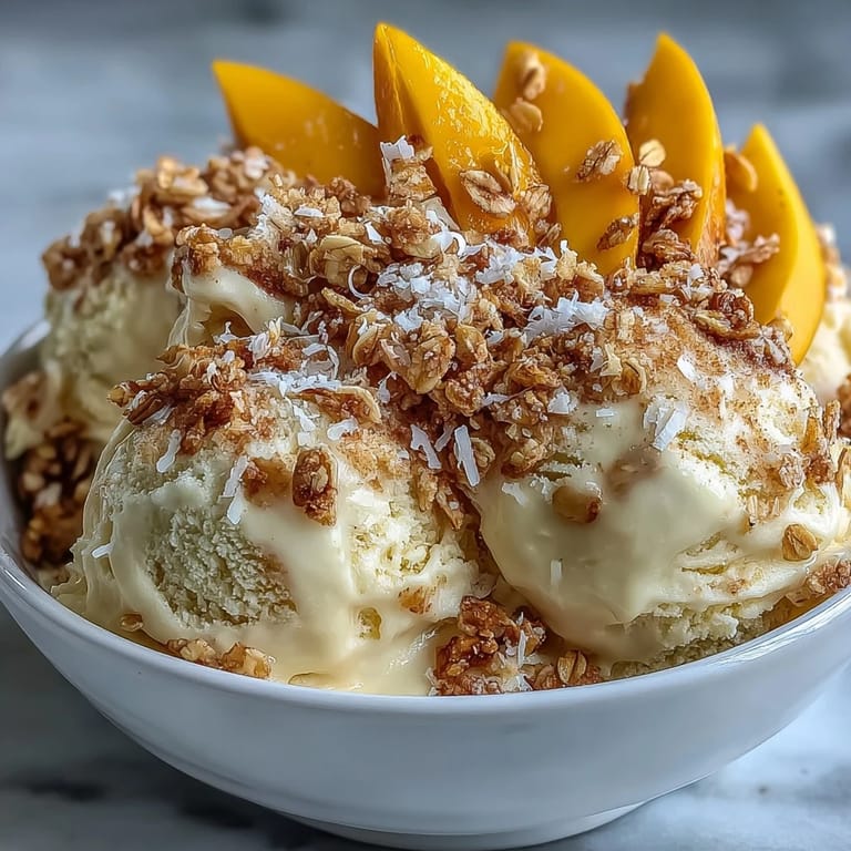 Save to Pins Imagine the perfect tropical dessert that combines the sunshine sweetness of ripe mangoes with the creamy richness of coconut milk. This Vegan Mango Coconut Ice Cream with Toasted Oats brings together these irresistible flavors in a refreshing frozen treat that's completely dairy-free. The contrasting textures of silky smooth ice cream and crunchy toasted oats create a dessert experience that's both indulgent and refreshing.